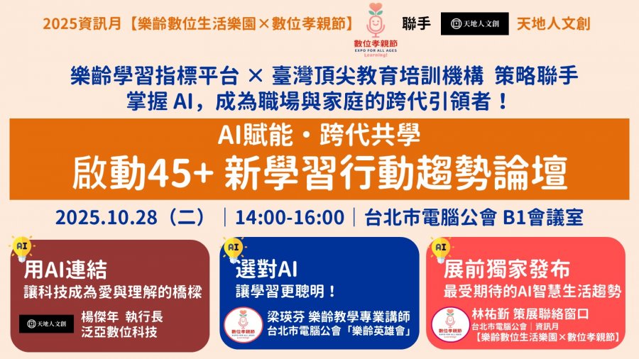 獨家亮點|這場論壇是 2025 資訊月【樂齡數位生活樂園×數位孝親節】的暖身啟動場,是搶先掌握最受期待的AI應用趨勢與展會亮點的絕佳機會!