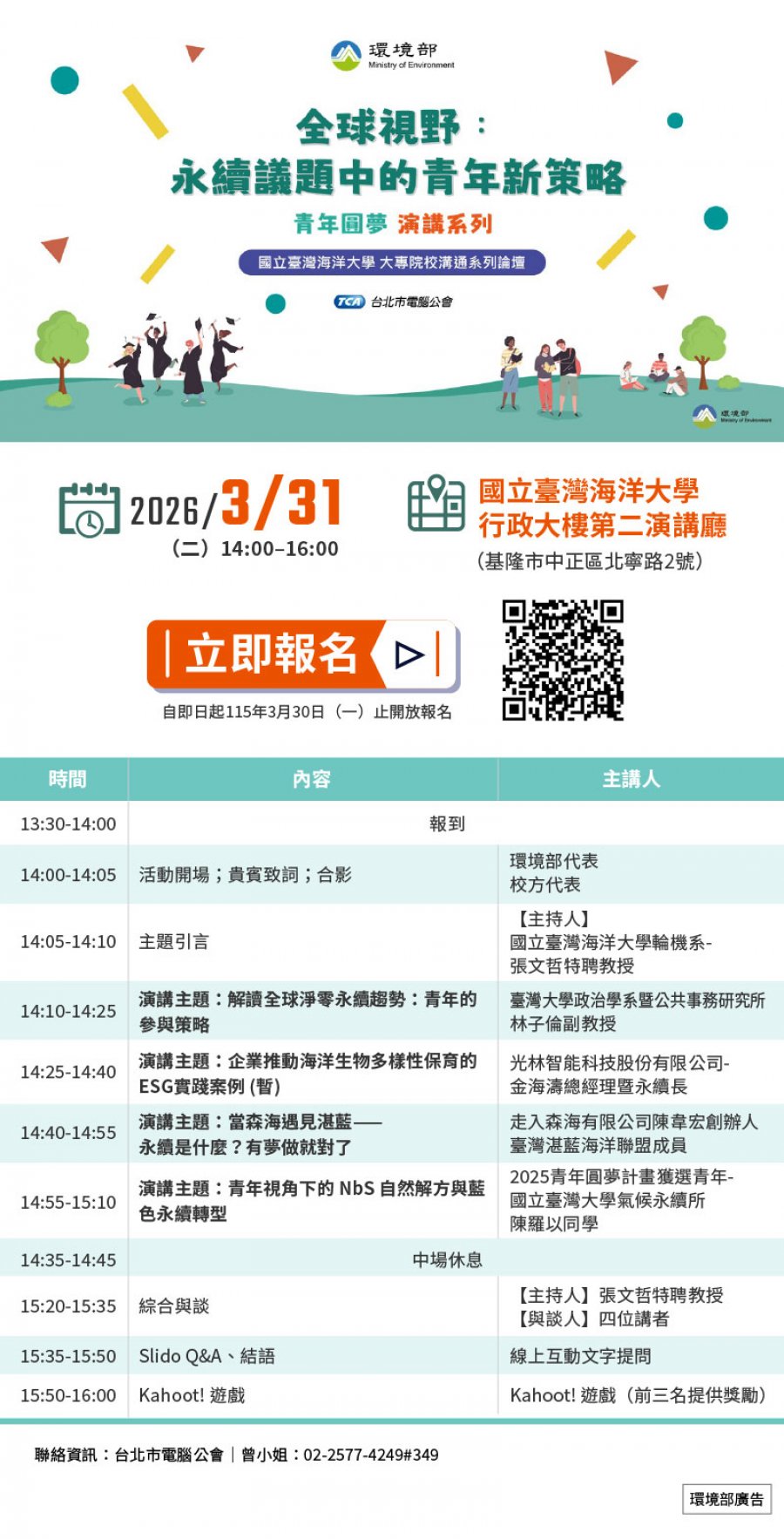 本場論壇匯聚政府政策、產業創新、NGO倡議與青年觀點,四大視角深度對話,全面解析台灣青年在全球綠色浪潮中的定位。這不僅是知識的交流,更是視野的升級。邀請你一同探索如何運用專業與熱情,成為國際化的永續人才。