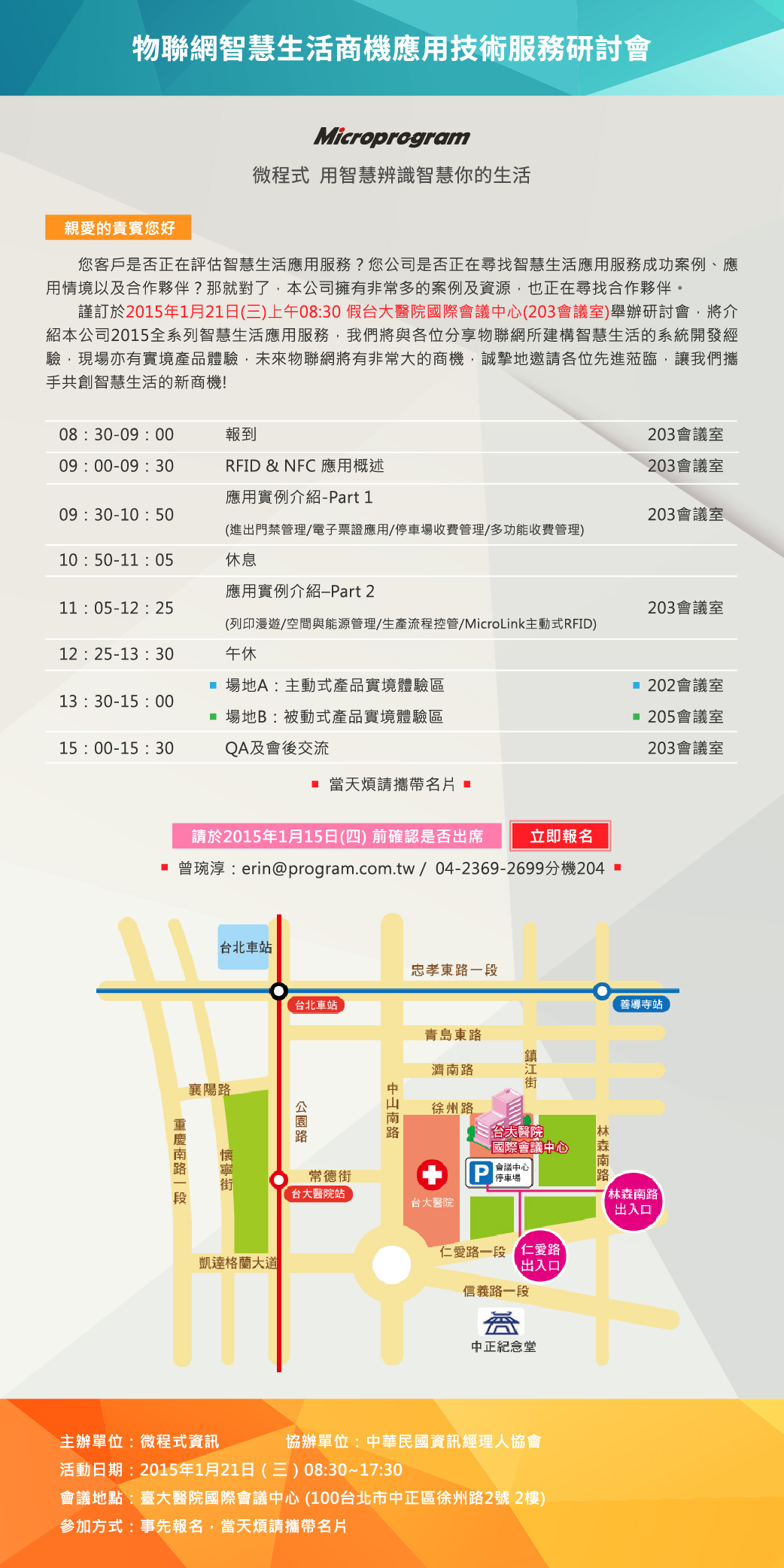 微程式資訊謹訂於2015年1月21日(三)與2015年1月23日(五),於台北、台中舉辦研討會,將與各位先進介紹公司2015全系列智慧生活應用服務,我們將與各位分享物聯網所建構的智慧生活,現場亦有實境產品體驗,可讓各位親身體驗物聯網所帶來便利生活!