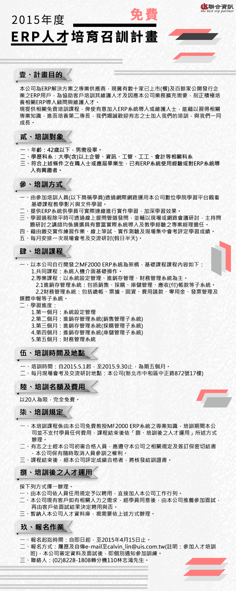 聯合資訊為ERP解決方案之專業供應商,現擁有數十家已上市(櫃)及百餘家公開發行企業之ERP用戶,為協助客戶培訓其維護人才及因應本公司業務擴充需要,刻正積極培養相關ERP導入顧問與維護人才。 現提供相關免費培訓課程,俾使有意加入ERP系統導入或維護人士,能藉以習得相關專業知識,進而培養第二專長,我們竭誠歡迎有志之士加入我們的培訓,與我們一同成長。