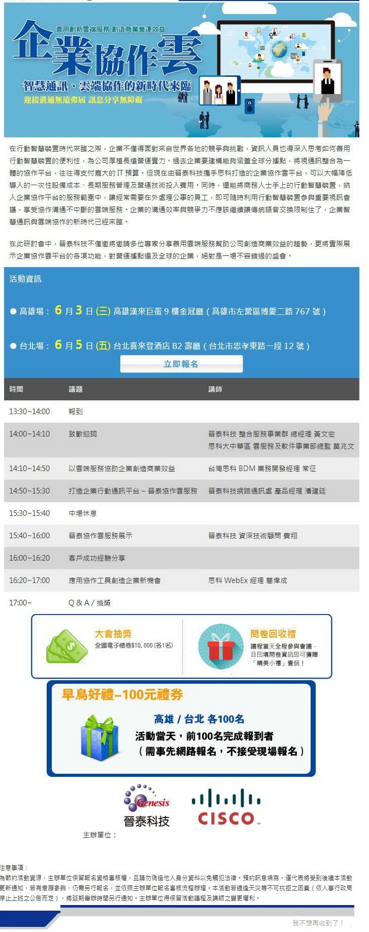 在此研討會中,晉泰科技不僅邀將邀請多位專家分享善用雲端服務幫助公司創造商業效益的趨勢,更將實際展示企業協作雲平台的各項功能,對營運據點遍及全球的企業,絕對是一場不容錯過的盛會。