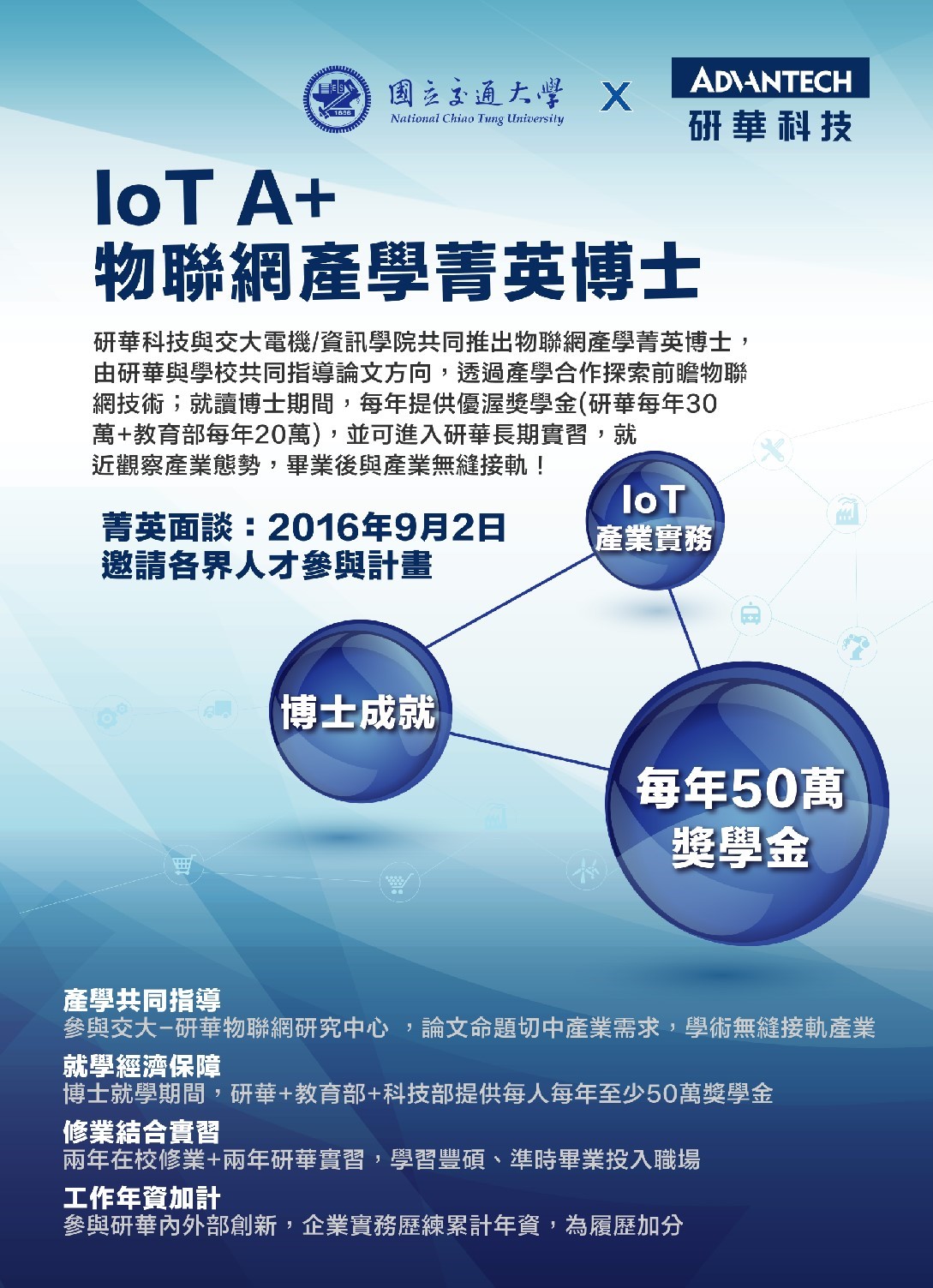 擔心攻讀博士與產業脫軌?就業困難?經濟壓力大? 交大x研華 物聯網產學菁英博士計畫提供每位產學博士每年50萬獎學金 由研華與交大共同指導研究,讓你同時擁有IoT實務與博士成就! 今年將著重在智慧醫療和智慧工廠的研究領域 歡迎有興趣的的夥伴加入計畫 3/10前繳交申請書 3/20進行菁英面談 返回校園進修的好機會,不要錯過囉