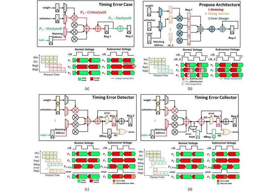 剪枝技術也是模型壓縮中非常常見的一種方法,它透過移除「不重要或不必要」的權重和神經元,來減少模型的計算量和儲存需求。「高面積使用效率之可操作於低電壓的稀疏神經網路加速器」也透過雙階段剪枝有效壓縮模型參數至原始的0.47%,顯著降低記憶體訪問次數。硬體方面,經過重定時以及時序借用後,可運行於更低電壓,並與參考架構比較,本設計於400MHz下功耗與能耗有1-4成的提升、面積減少一成、可操作於0.65V。使板上晶片功耗可減少約三成,酬載系統續航時間延長約一成。