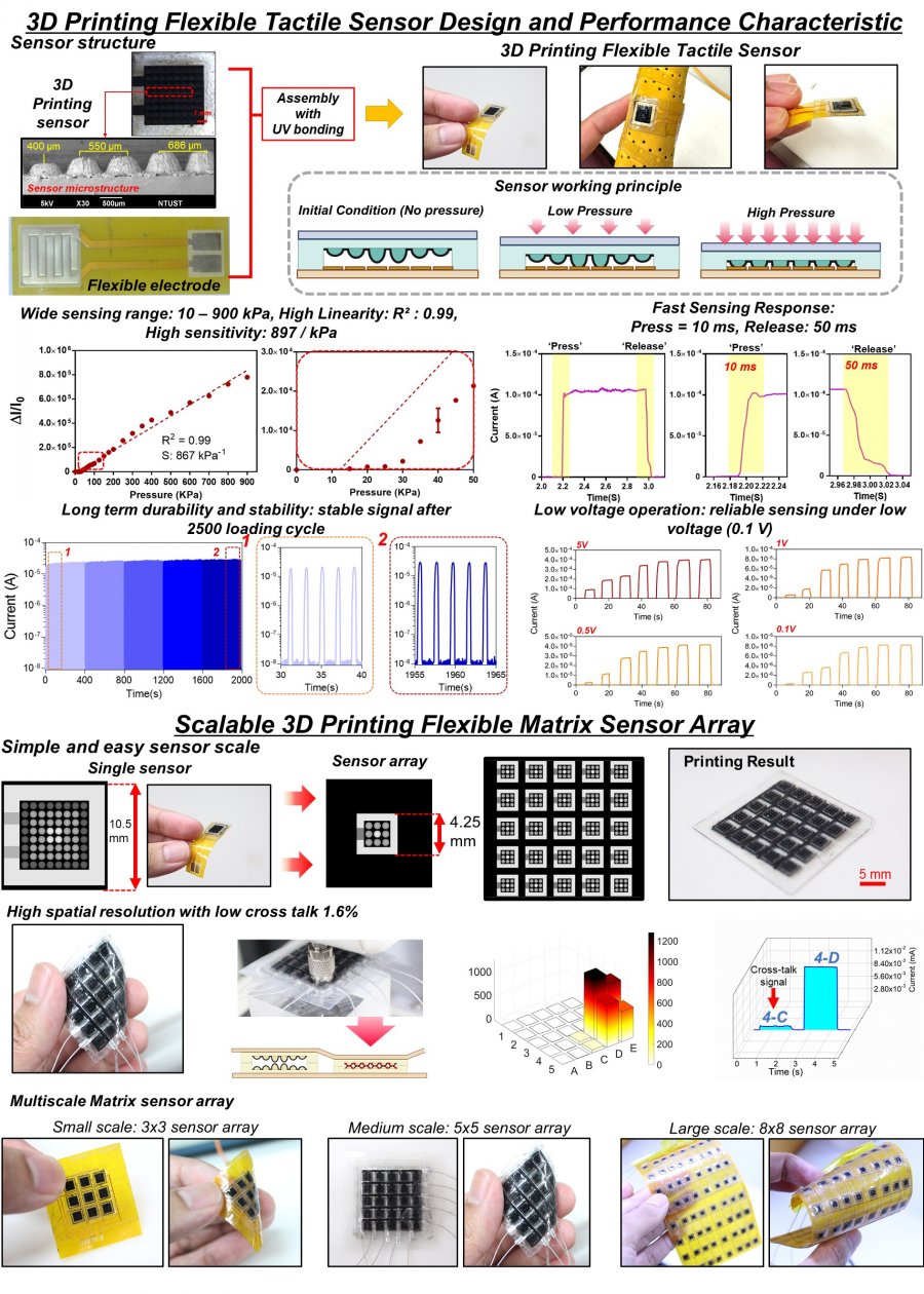 現有運動科技如IMU(慣性測量單元,Inertial Measurement Unit)、攝影系統與壓力鞋墊受限於無法量測受力、高成本與靈敏度不足。「多尺度3D列印可撓式觸覺感測器」為3D列印柔性觸覺感測陣列,具高靈敏度(10,692kPa⁻¹)、快速響應(10毫秒)、低功耗(0.1V),10秒內免模具製作,成本低(約100 元),可客製化,具突破性優勢。