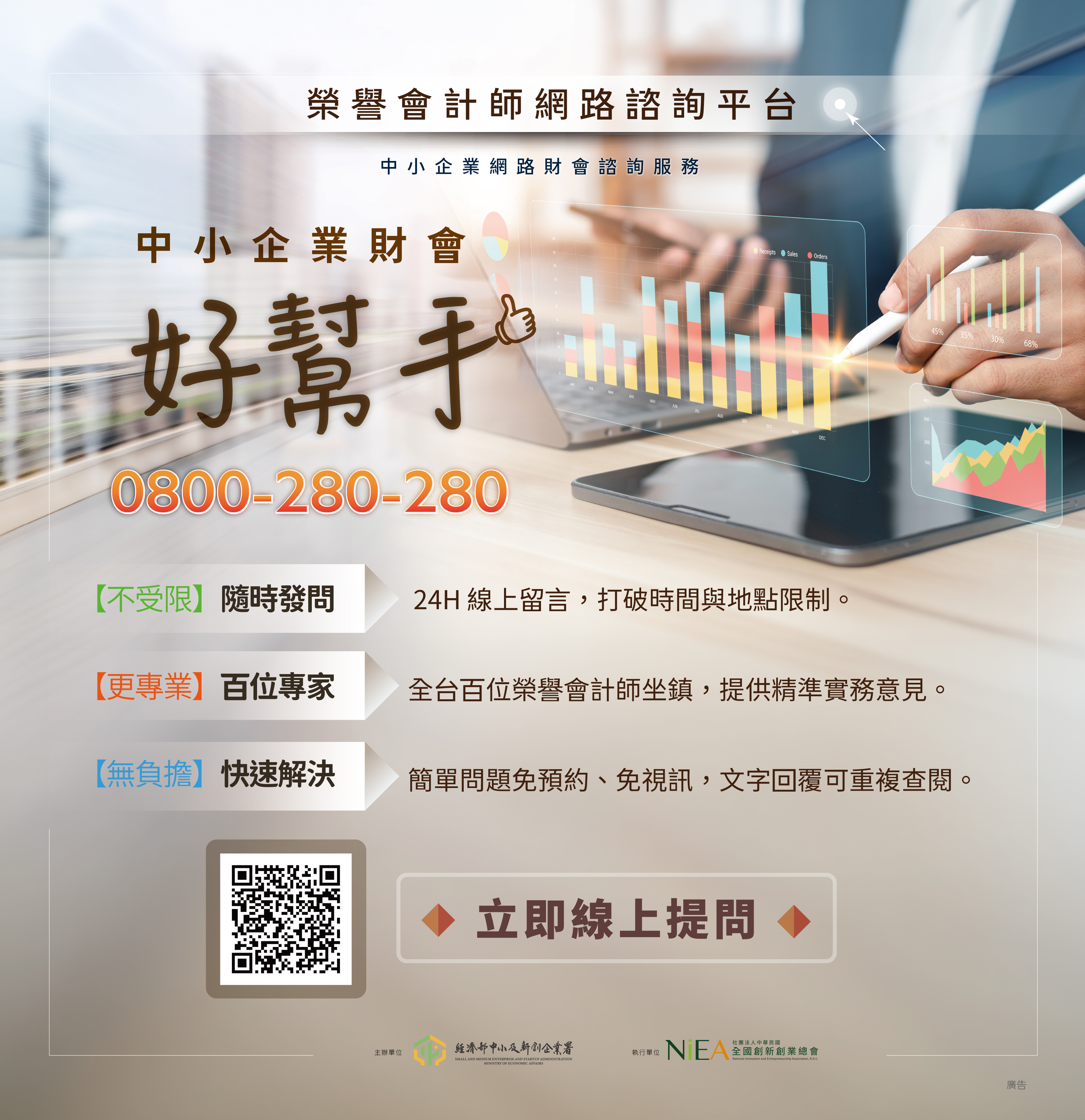 馬上辦服務中心單一平台之財會資源專區,並提供免費之榮譽會計師中小企業財會諮詢服務,包含預約制諮詢(預約網址:https://reurl.cc/Q2dv2p)及網路財會諮詢(網址:https://reurl.cc/R24ZkZ)。
