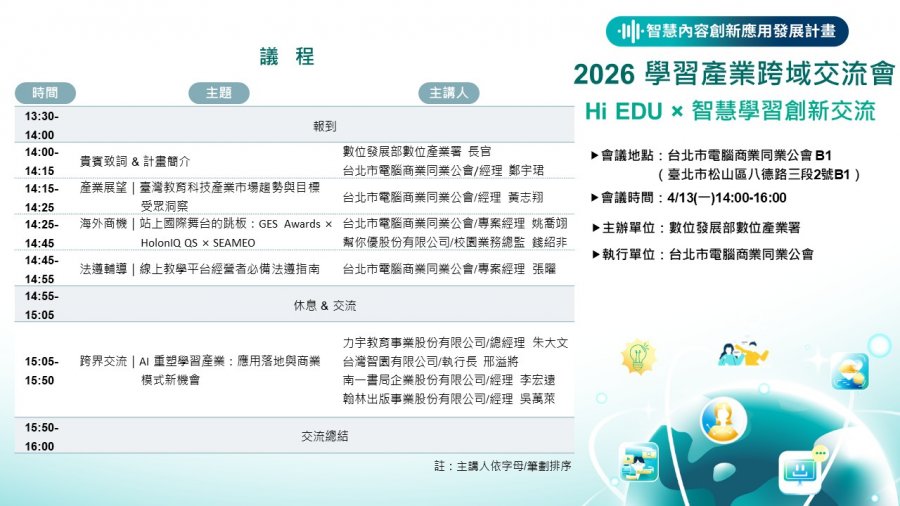 執行數位發展部數位產業署「智慧內容創新應用發展計畫」, 為推動學習產業創新發展與跨域合作交流,4/13(一)14:00-16:00於台北市電腦商業同業公會B1辦理「2026學習產業跨域交流會」,分享產業最新發展趨勢、海外商機及創新服務模式,協助業者掌握趨勢,促進異業結盟與合作媒合,期待打造更多交流、合作與共創的機會。