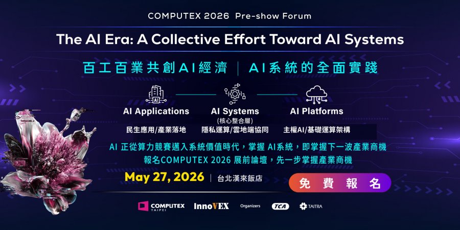 本會將於 5 月 27 日舉辦 COMPUTEX 2026 展前論壇,邀集國際雲端平台業者、AI 運算與晶片廠商及跨領域專家,解析 AI Systems 在各產業場域的整合與落地策略。