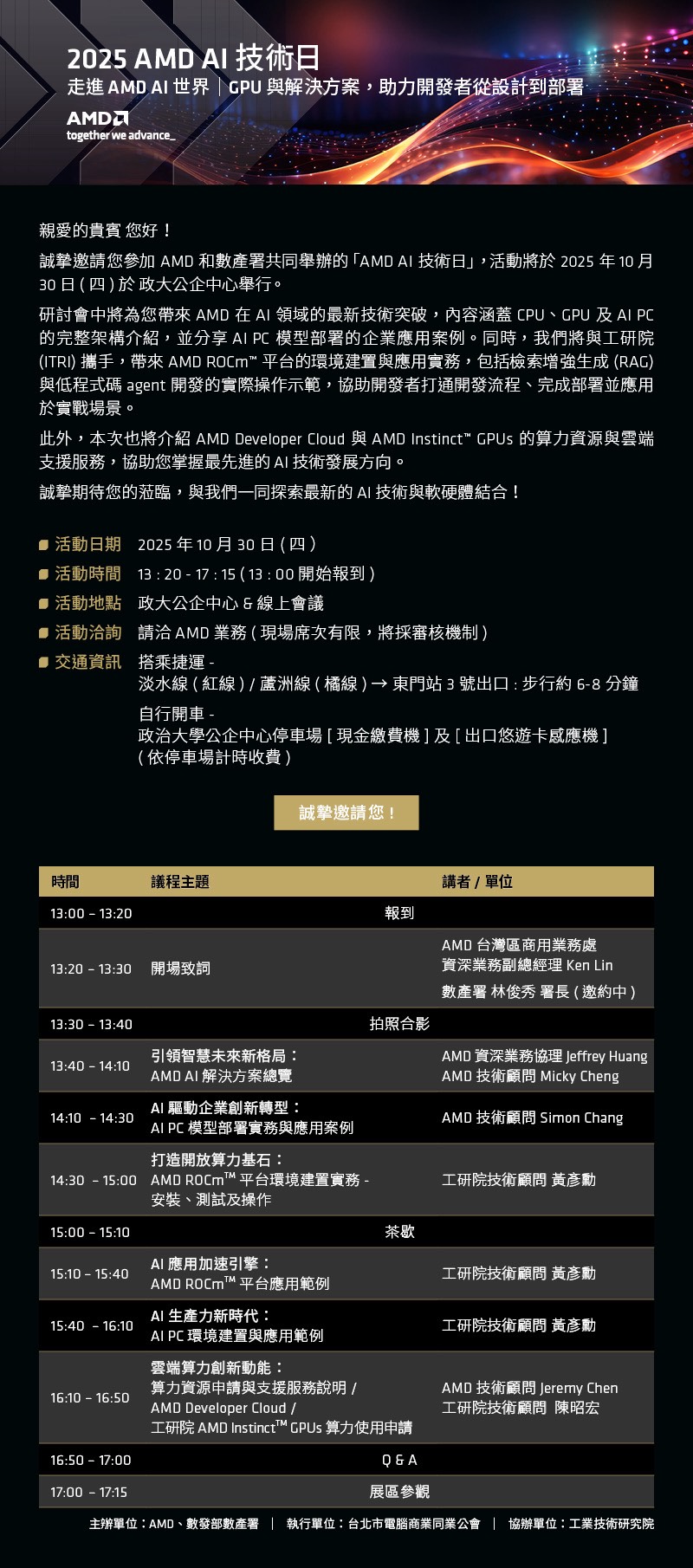 此次盛會將為您帶來AMD在AI領域的最新技術突破,內容涵蓋CPU、GPU及AI PC的完整架構介紹,並分享AI PC模型部署的企業應用案例。同時,我們將與工研院,(ITRI)攜手,帶來AMD ROCm 平台的環境境建置與應用實務,包括檢索增強生成(RAC)與低程式碼agent開發的實際操作作示範,協助開發者打通開發流程、完成部署並應用於實戰場景。