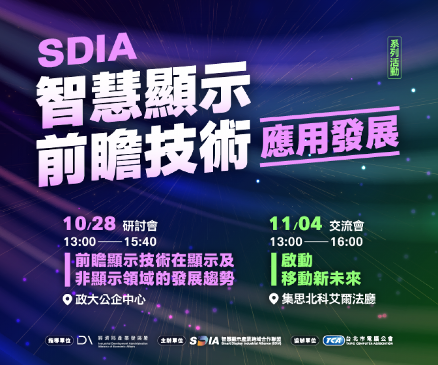 經濟部產發署智慧顯示產業跨域合作聯盟(SDIA)整合產官學研資源,舉辦「智慧顯示與 AI」跨域系列活動,聚焦次世代顯示技術在顯示與非顯示場域、智慧移動的實務與合作契機,歡迎產業與研發夥伴參與交流。