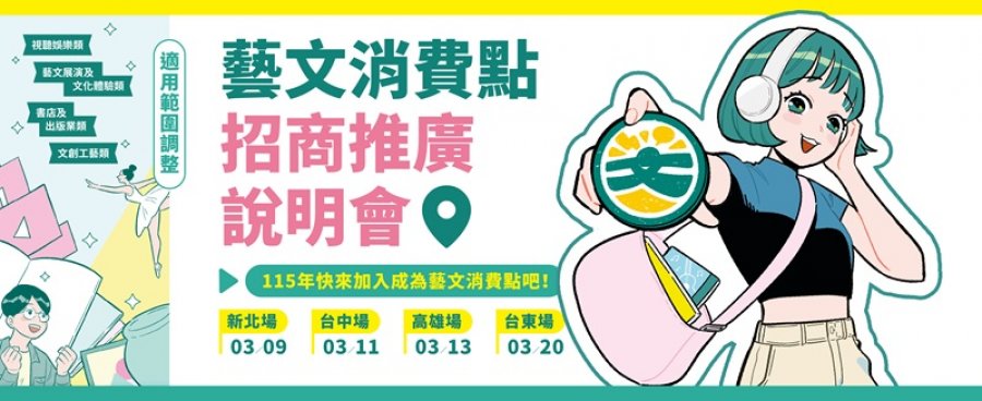 為協助更多藝文產業加入藝文消費點建構青年文化消費生態系,將於3月9日至3月20日於新北、台中、高雄、台東辦理4場「藝文消費點招商推廣說明會」,聚焦說明申請加入程序、請款流程及適用範圍等重點事項;未能到場者亦可透過新北場直播與回放影片瞭解相關內容。