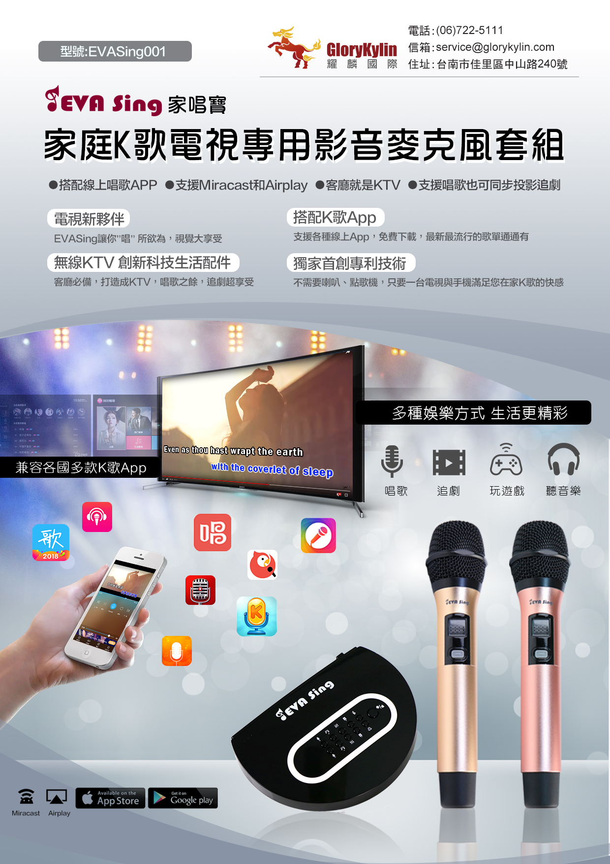 EVASing是一款基於無線投影技術發展出的K歌套組,透過無線投影手機畫面到電視上,再加上麥克風專利混音技術,輕鬆將客廳打造成KTV!