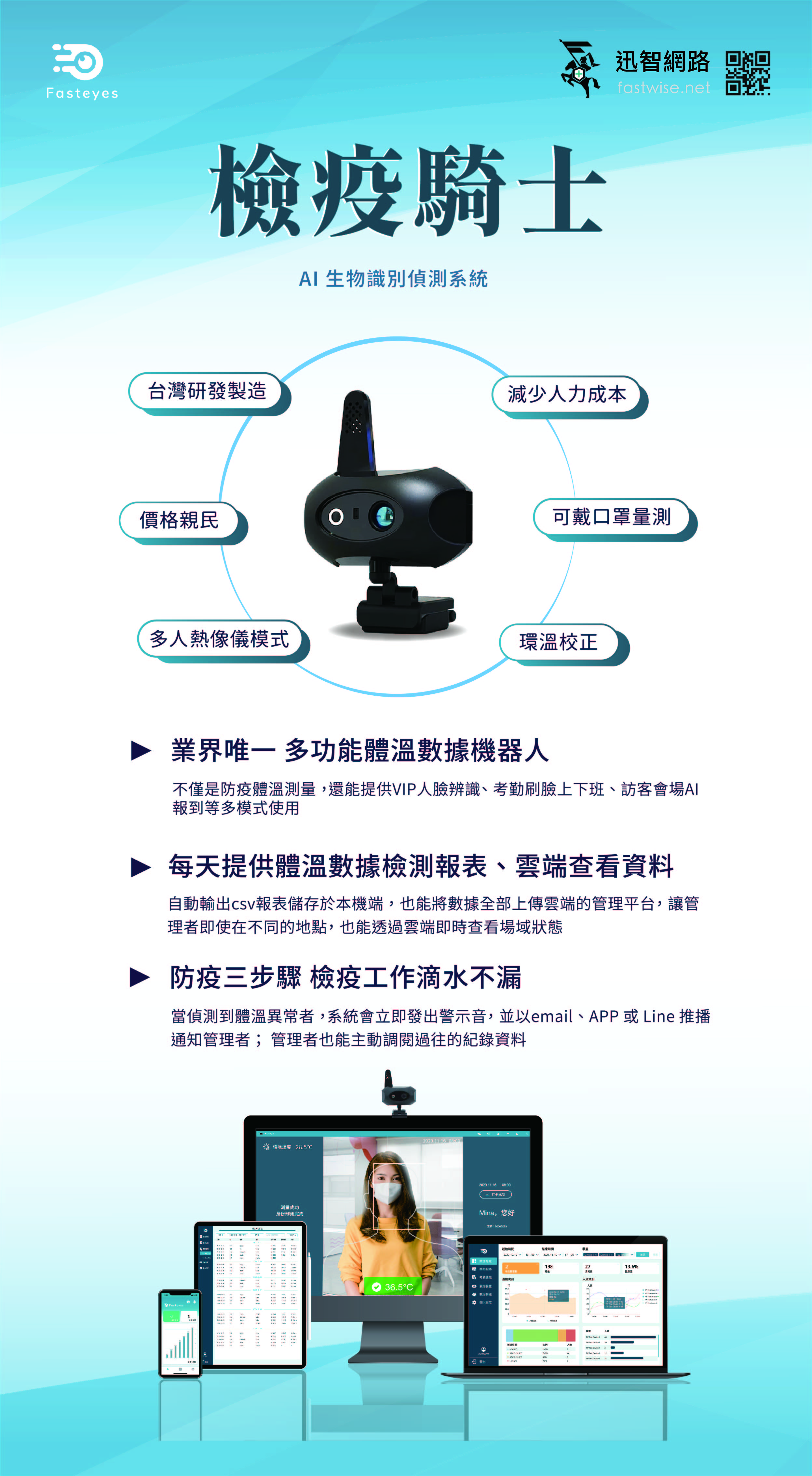 其實您可以有更友善的選擇!迅智網路為提供使用者更加便利、售價更為親民且包含數據反饋的新型檢測模式,設計「檢疫騎士Fasteyes」產品,結合人臉識別、口罩辨識、體溫異常警告、串連通訊軟體警示功能,以及擴充考勤管理功能。達到一機多用的服務體驗,讓檢疫工具不再只是這一波疫情下的附屬品。