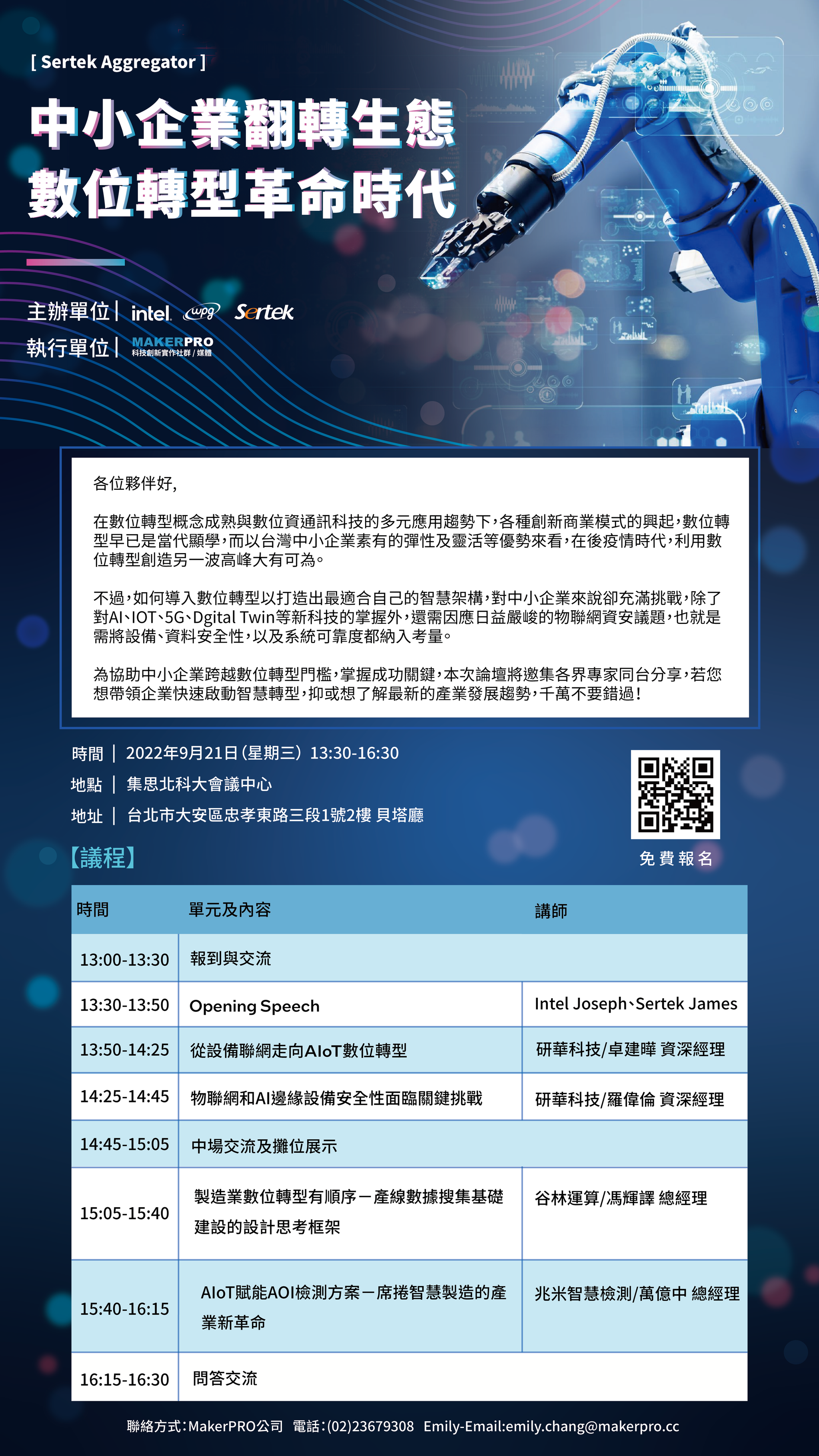 為協助中小企業跨越數位轉型門檻,掌握成功關鍵,本次論壇將邀集各界專家同台分享,若您想帶領企業快速啟動智慧轉型,抑或想了解最新的產業發展趨勢,千萬不要錯過!