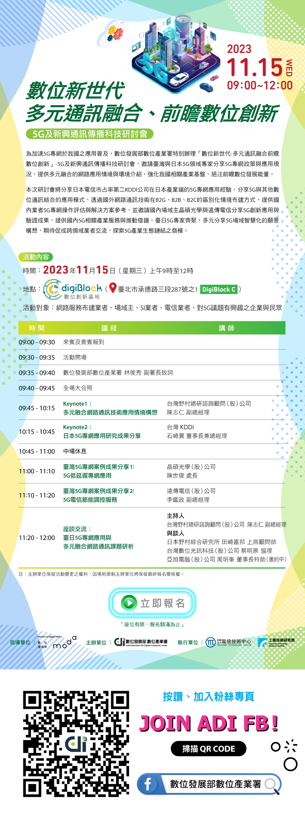 數位發展部數位產業署將於112年11月15日(三)舉辦「5G及新興通訊傳播科技研討會」,主要為: