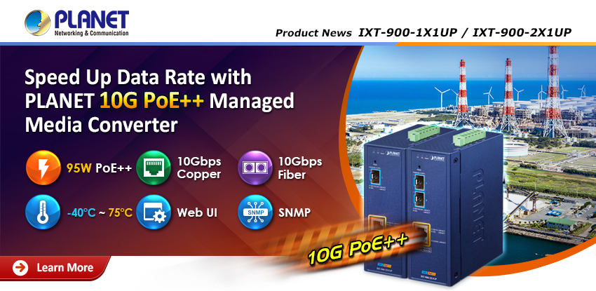 IXT-900-1X1UP a resilient 10G PoE++ managed media converter, facilitates rapid 10G connectivity and seamless media conversion between copper and fiber optics. Equipped with 95W power delivery on the copper port, it is ideal for powering devices such as pan tilt dome cameras, HD displays, and Wi-Fi 7 APs.