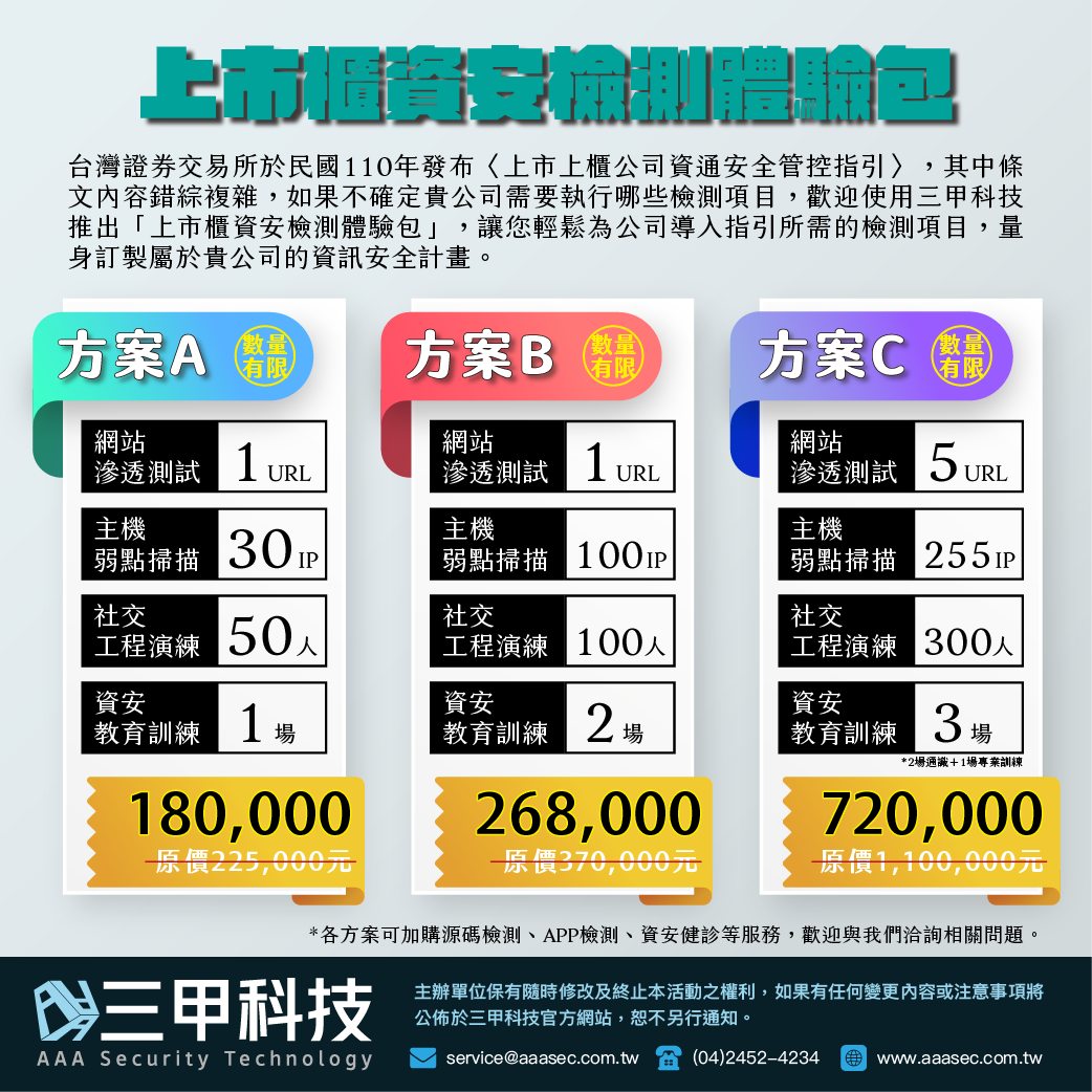 #數量有限,歡迎來電洽詢,為您量身訂製最合適的資安檢測服務
