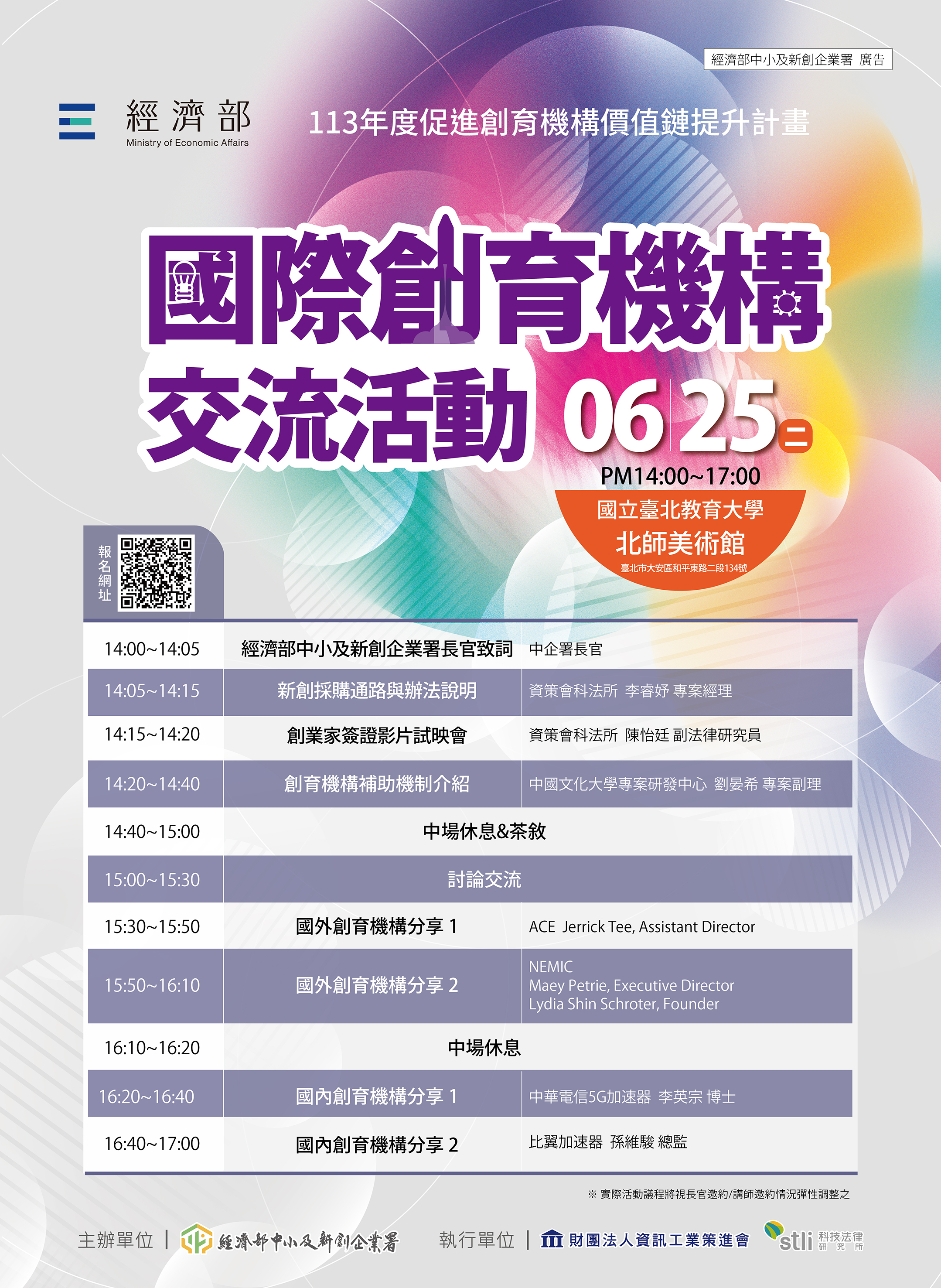 為促進我國創育機構與外國創育機構互動、建構各創育機構輔導育成與外國鏈結經驗交流之平臺,今年特別邀請 #美國創育機構NEMIC、#新加坡創育機構ACE、#中華電信5G加速器、#比翼加速器 進行聯合分享!