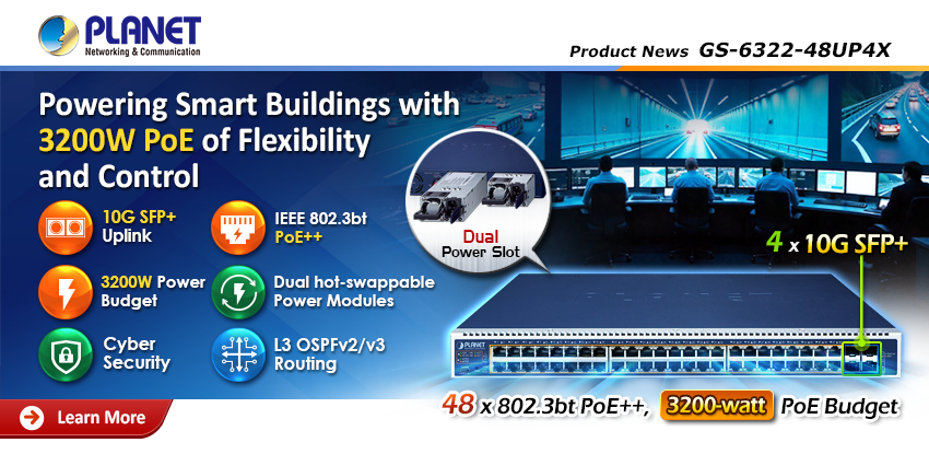 PLANET GS-6322-48UP4X is a high-performance Layer 3 PoE++ switch designed for power-intensive and mission-critical environments. It provides 48 IEEE 802.3bt 95W PoE ports and 4 10G SFP+ uplinks for flexible, high-speed connectivity.
