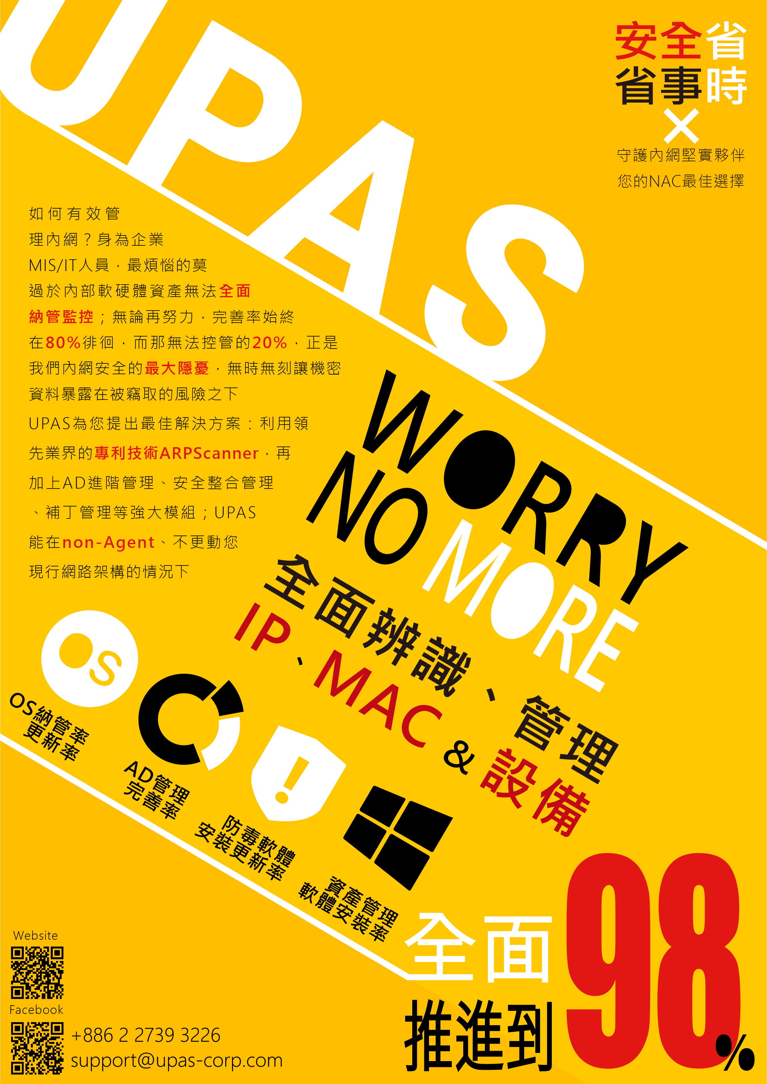 UPAS即將於5月重磅推出7.0重大升級,耗資1500萬的全新UI/UX,除了工作效率全面提升外,UPAS的功能更涵蓋:網路存取控制(NAC)、IP位址管理(IPAM)、身分識別管理(IAM)、IT資產管理(ITAM);並擁有:全自動化管理、無痛導入(免802.1 X)、專利發送封包少(網路無負擔)、AD/OS/防毒/資產管理軟體98%全面納管等優勢領先業界;內網安全、桌面安全、接入安全,UPAS一套系統、一個介面、幫你一次搞定!